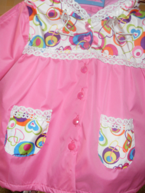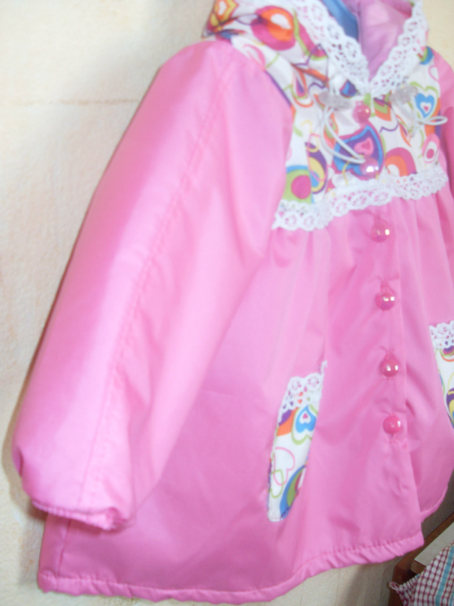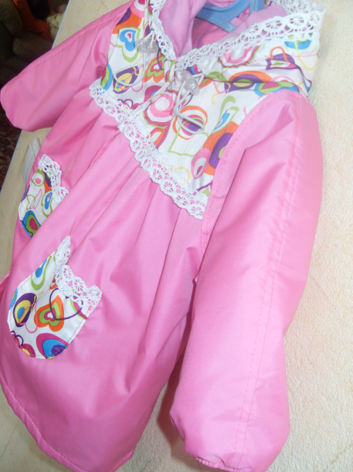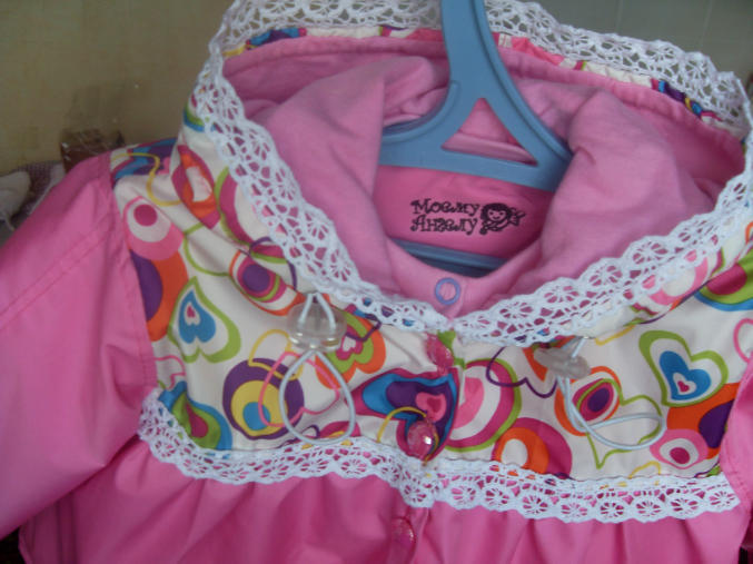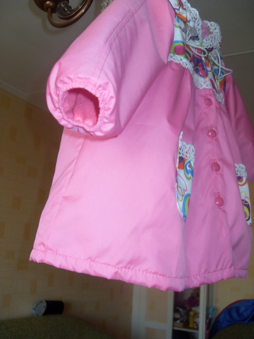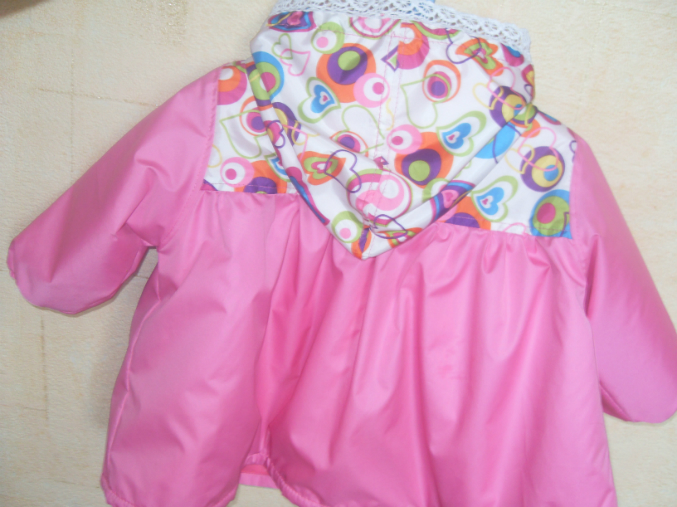 Шитье одежды, выкройки, ремонт одежды, шторы, швейные машины (уже приобретенные)Вот и моей крошечке сшила плащик из плащевки на ростовку 80 см. выкройка из отобре 2003-2, хотя она у меня еще 74 см., на подклад взяла флис, для капюшона на подклад х/б трикотаж, капюшон регулируется с помощью кулиски и фиксаторов. По горловине пришила трикотажную узенькую манжету, которая застегивается на кнопочку. А у самого плащика на застежку сделала перламутрово-розовые пуговицы. По низу рукава резиночка, так что на ручке держится хорошо...даже если пока еще чуть чуть великовато. Вообщем вот фото на хваст
