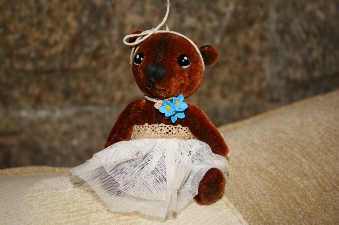 Игрушечный мир - животныеНу не нравился этот медведь мне с самого начала,с момента,когда я открыла посылку и увидела эту чудовищного цвета ткань.По этому,пыталась его улучшить всеми доступными мне способами. Рост11см,5 шплинтов,стоит самостоятельно,цветы из запекайки.