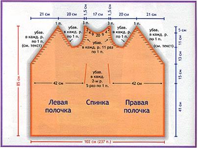 Вязать, как одну деталь. Буклированной нитью набрать цепочку из 237 в. п. и вязать все изделие полуст. с/н. На высоте 41 см выполнить вытачки. На расстоянии 42 см от каждого края убавить в каждом 2-м р. 5 раз по 1 п. и вязать прямо. На высоте 56 см для выреза горловины переда убавить в каждом р. по 1 п., помня, что убавления необходимо выполнять, провязывая 2 полуст. с/н вместе в конце р. или в начале следующего р. На высоте 69 см разделить работу на 3 части. Вязать полочку, продолжая выполнять вырез горловины, убавить со стороны проймы в каждом р. по 1 п. до тех пор, пока не останется 1 п. Вторую полочку вязать симметрично. Продолжить вязание 78 п. спинки, убавляя с обеих сторон в каждом р. 11 раз по 1 п. Через 11 см от начала вязания пройм закрыть для выреза горловины центральные 20 п. и убавить в обе стороны от них в каждом р. 9 п., 4 п. и 2 п. Когда останется по 3 п. каждого плеча, закончить вязание.