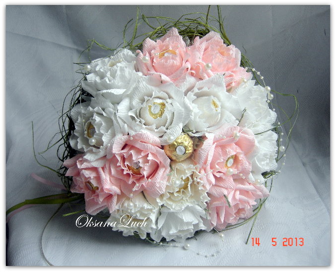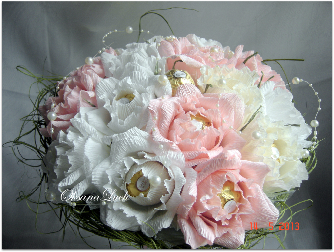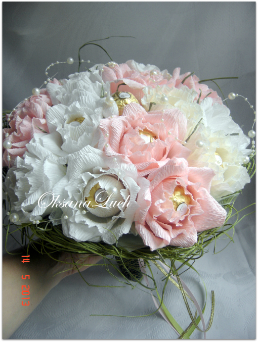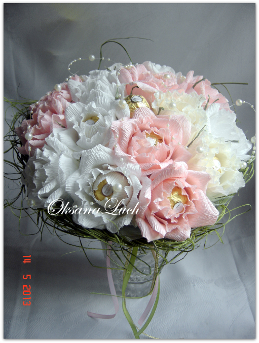 Спасибо. С ручкой намучилась, даже не знаю как объяснить...без портбукетницы. Пыталась сформировать как-то. Гофрой, сеткой, фиксировала проволокой.