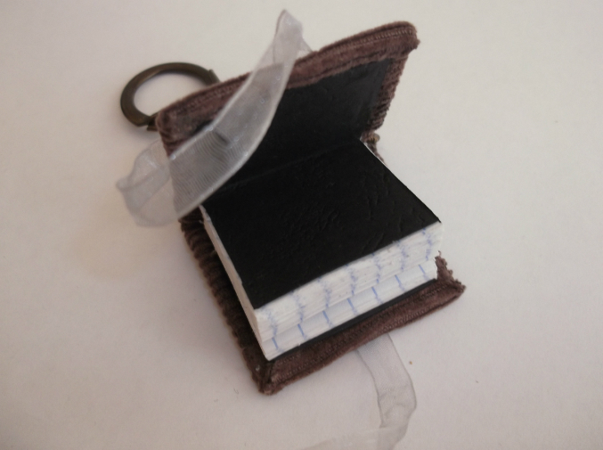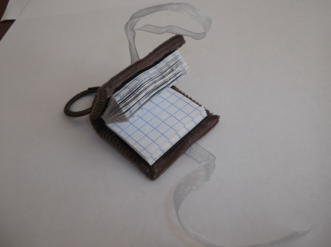 Делается по принципу всех блокнотов. Сначала нарезала бумагу на листочки 4х6 см. Согнула каждый пополам и собрала в книжечки по три листа. На блокнот пошло 10 книжечек. собрала книжки стопочкой и зажала между двумя картонками с помощью биндеров.Разметила корешки для прошивки на три дырочки и сделала насечки треугольным напильничком (видела где-то, что так делают) . Сшила коптским переплетом, в сети много мастер классов. Приклеила корешок клеем момент-гель и дала основательно просохнуть. Макетным ножом под линейку обрезала блок (наверное самый сложный процесс) Обложку вырезала из картона от коробки на 2мм больше размеров блока, корешок из картона для детского творчества оклеила тканью, проделала на корешке дырку для луверса и установила его. В луверс закрепила колечко от цепочки с какрбином. Из декоративного картона вырезала два форзаца размер как две странички согнула и преклеила к первой и последней страничке блока свободную часть форзаца приклеила к готовой обложке. Без фото процесса сложно обьяснить, я до этого много инфы просмотрела в сети. Поищите МК блокнот с нуля. Здесь тоже самое только перед соединением блока и обложки надо закрепить колечко для брелока, ну размер маленький.