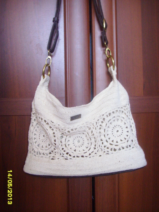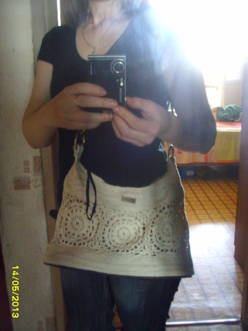 Загорелась я связать себе сумочку видела здесь вязали он-лайн, для меня очень актуальный вопрос , т. к. у меня нет вообще сумки! знакомая дала пару сумок "на выброс".Я некоторые части от них позаимствовала и наконец я её доделала .Немного она получилась перекошенная , делал все на глаз, а надо было все таки расчитывать петли( было лень считать и нетерпелось связать быстрее)Но в целом я результатом довольна
