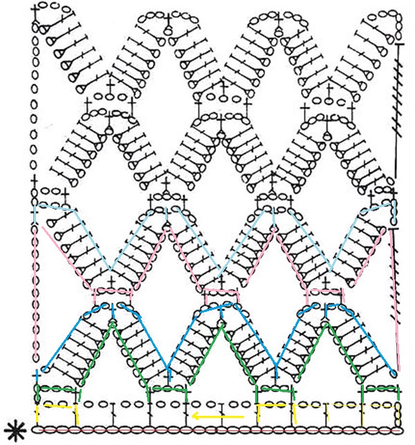 На схеме набрано 31 вп, 3 вп подъёма, * 2 вп, стн* - от * до * повторять до конца ряда