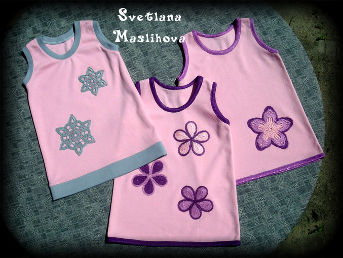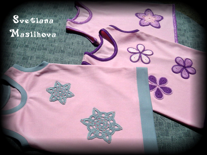 И маечки из хлопка, за одно нашла куда пристроить вязаные цветочки, которых уже куча целая набралась.