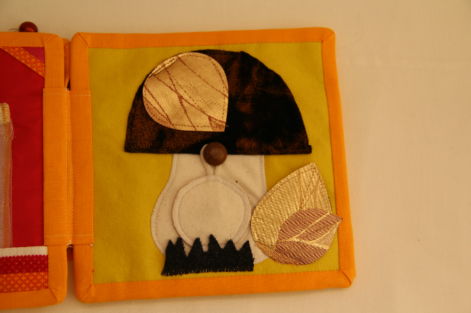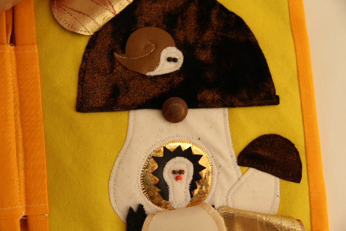3 страница: Осень-пора грибов (под листочками спрятались улитка и маленький гриб; внутри гриба живет еж, его можно увидеть, расстегнув пуговицу).