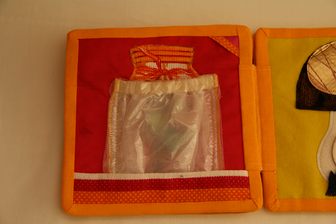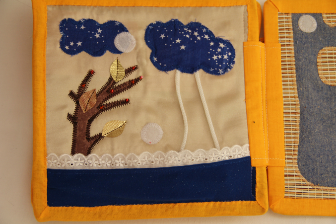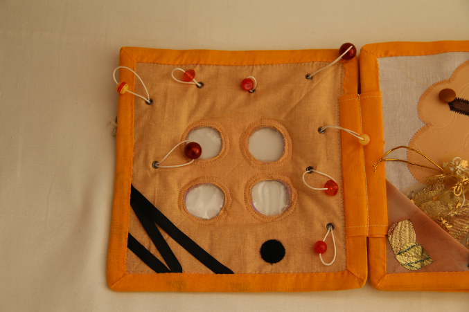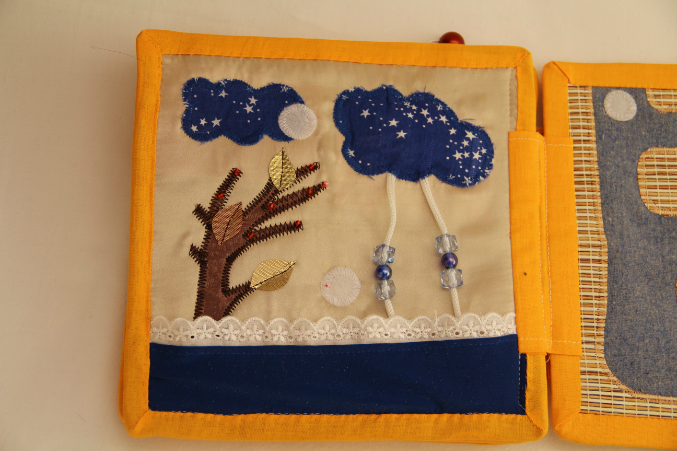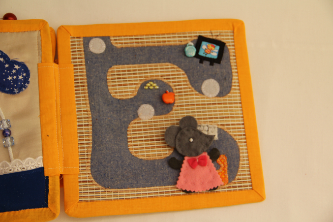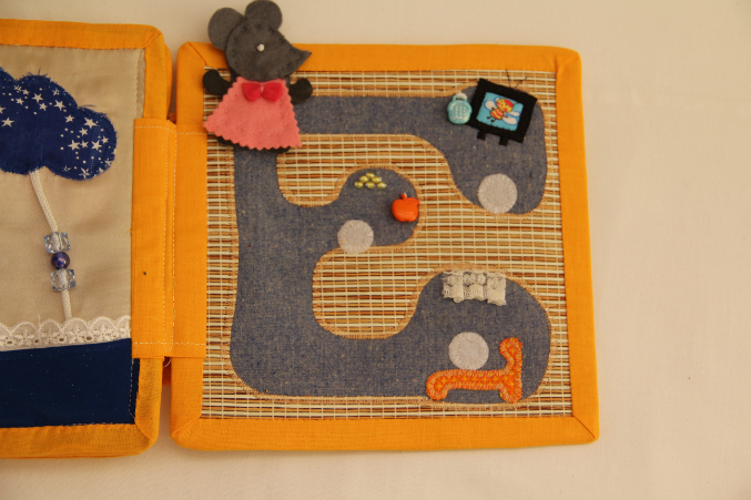5 страница: Погода осенью изменчива: бывает солнечно и сухо, бывает дождливо (солнышко на липучке, граненые голубые бусины-дождинки можно перемещать вверх и вниз). На странице есть липучка, на которую можно прикрепить мышку – героиню со следующей страницы).