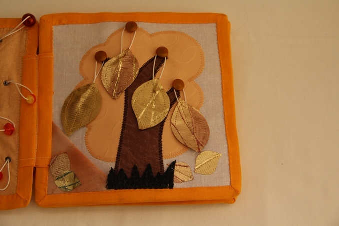 2 страница: Осенью листья на деревьях опадают (золотые листья можно пристегивать на пуговицы и отстегивать, собирать в мешочек)