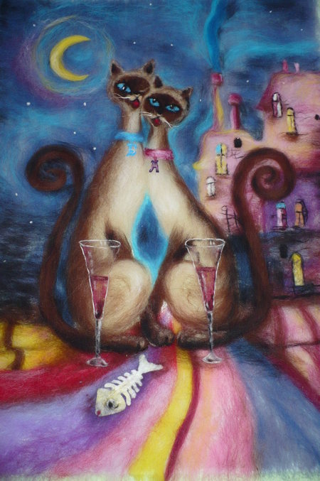 Фелтинг (валяние шерсти)Вот такую пару мне заказали воплотить из шерсти. По картине Ларисы Дюка "Влюбленные коты". Заказчик доволен!!! Я рада то же!