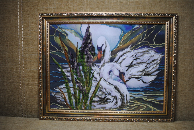 Нормальная работа, по моему. Просто добавить широкое паспарту светлое в тон лебедям и рамку светлую. Будет очень нежно и не мрачно. А эту рамочку для другой вышивки оставить. Так вообще очень изящный сюжет.