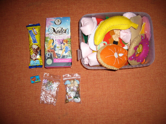 .Договаривались что Кристиночка сошьет для меня еду из фетра.И вот она у меня появилась...А так же Кристина приготовила для меня и моего сыночка подарки : замечательный чаек,шоколадный батончик,жевачки,пуговочки (тоже питаю слабость к ним!) и паетки.