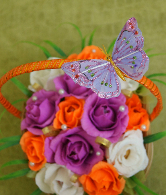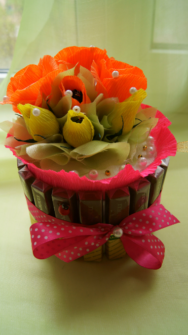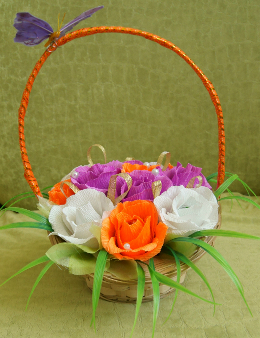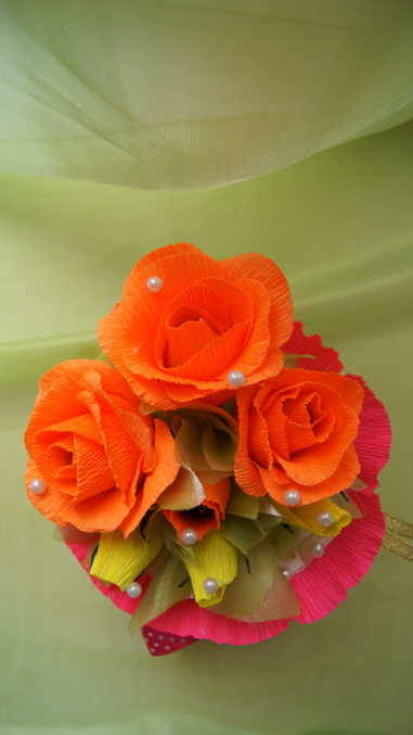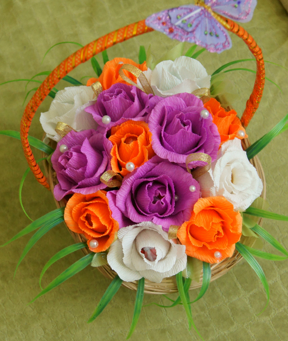 Юля, мне понравилось цветовой решение во втором букете. Розы исполнены очень хорошо. если еще не отдала, подрежь фунтик (на предпоследнем фото видно), не аккуратно смотрится, размахрился.