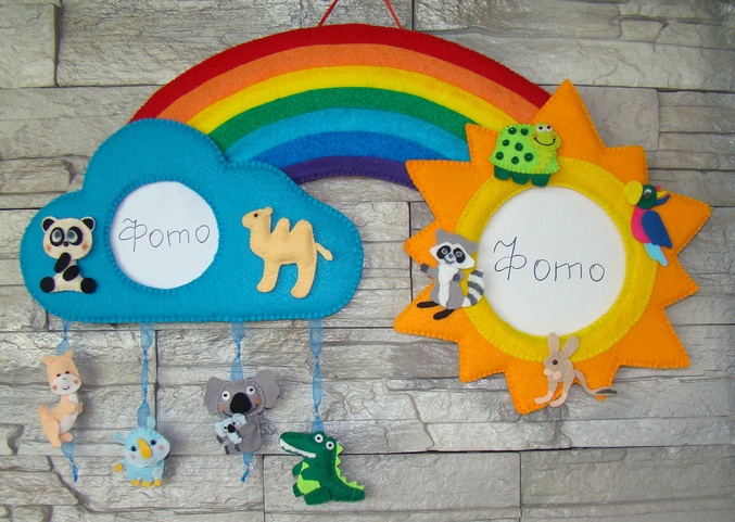 Размеры фотографии на облачке 8 см, солнышке 11,5 см. Фотографии легко можно менять (см. фото).