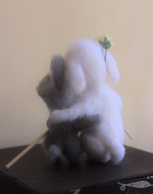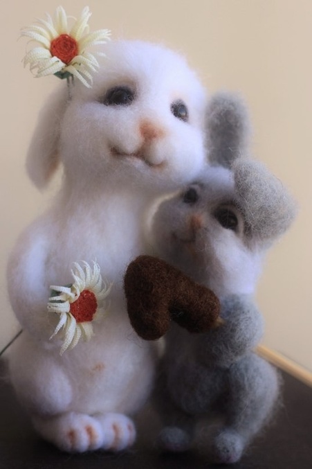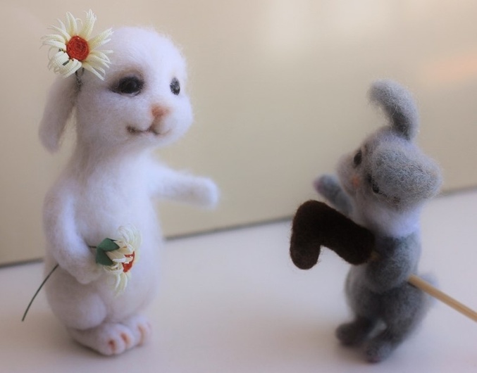 Фелтинг (валяние шерсти)Помните, заяц поехал весну звать? Пока ехал обратно, наступило лето. Вот так его бы встретили дома) У зайчишки- валенок на палке- воображает что это конь), у Зайки- ромашка за ушком