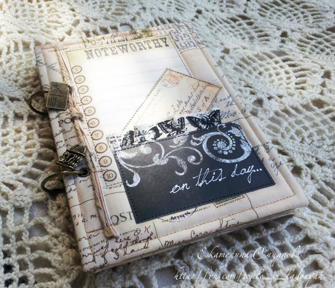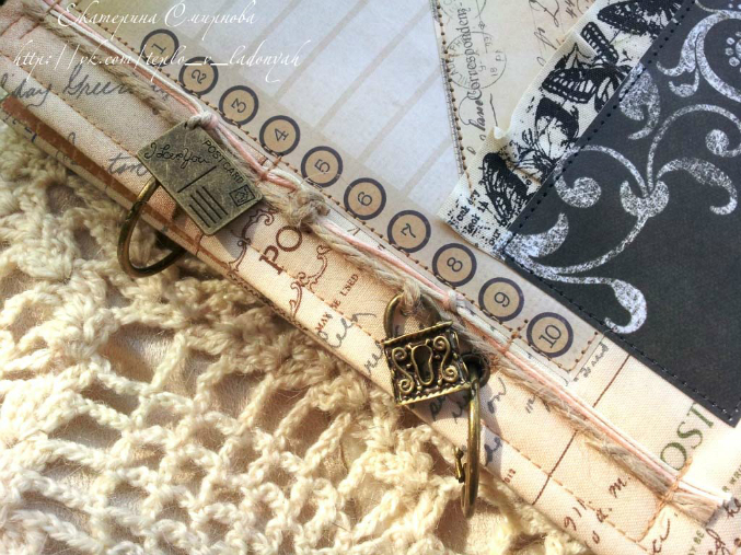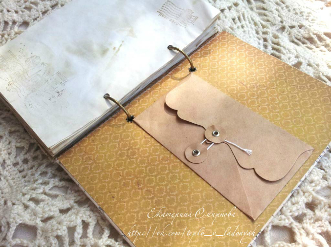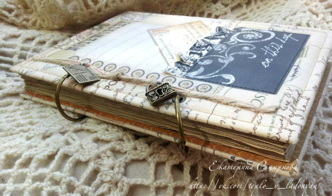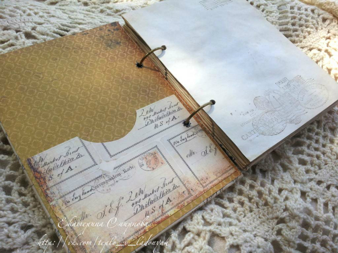 Блокнот на кольцах. Формат А5. Обложка мягкая, обтянута хлопком. Для оформления использована металлическая фурнитура, вощеный шнур, шпагат, скрапбумага. Внутри примерно 80 состаренных и проштампованных листочков. На переднем форзаце кармашек, на заднем - конвертик)