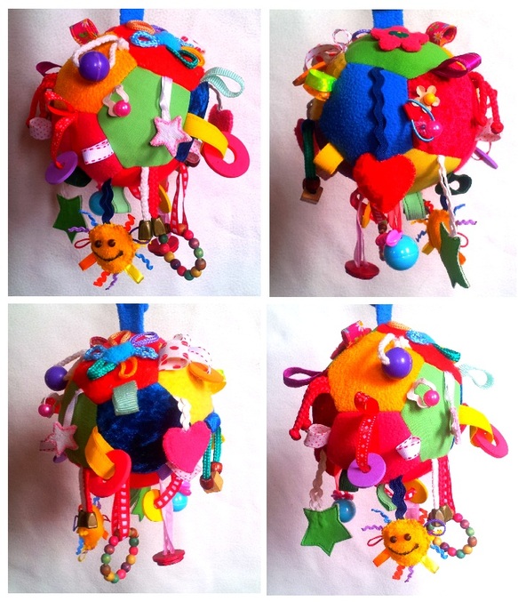 Шила мячик немножко раньше, малыш пока был совсем маленький на мячике учился целенаправленно трогать и очень любил лежать рассматривать свой мячик, ловить подвесочки). А сейчас у него это вообще любимая игруха. Так что не зря... Вот так мы и растём