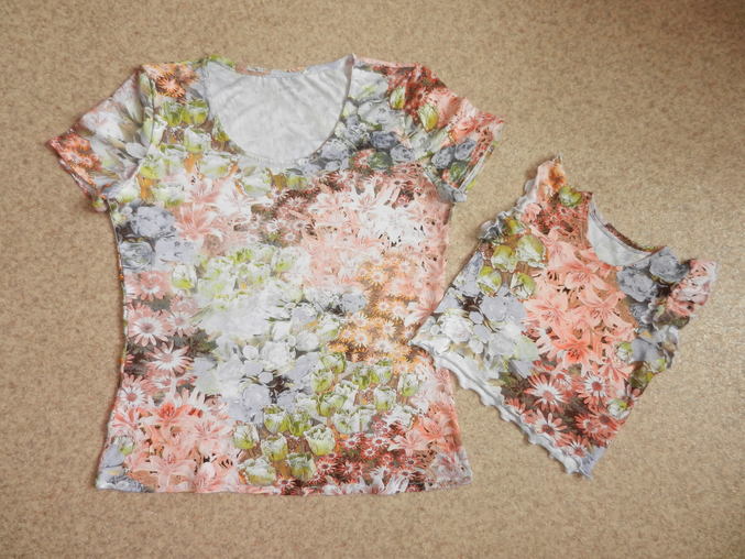 А из остаточков ( вернее из обрезков) решила и доченьке топ смастерить. Топ в форме маечки с широкими бретелями и с крылышками. Вышел немного коротковат, но потом я к низу пришила нижний волан (на фото ещё без волана).