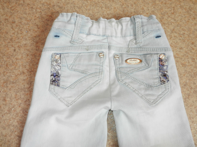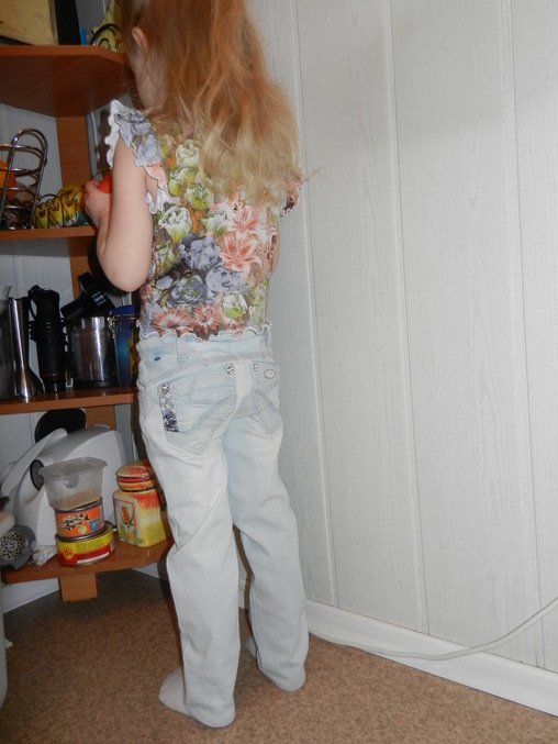 Старшая переберала в шкафу вещи и выкинула светлые джинсики, которые стали ей малы. Вот из них я и перешила Лизульке "обновку". Сейчас походим так (погода не айс), а потом на лето планирую их продырявить. В поясок вставила перфорированную резинку, объём талии регулируется с помощью этой резинки и пуговок.