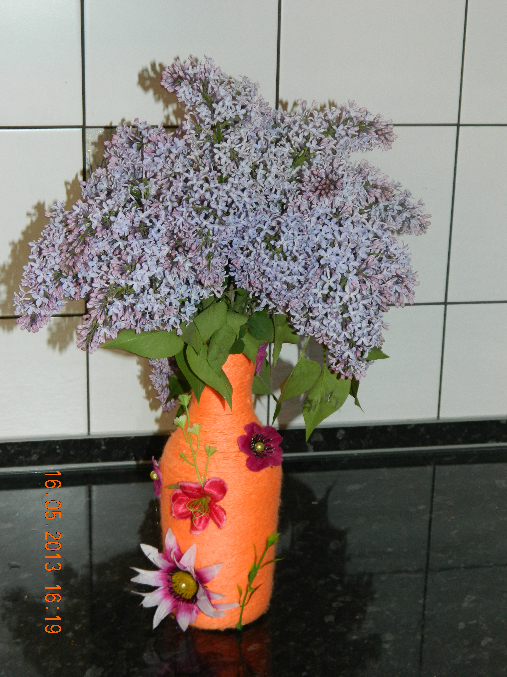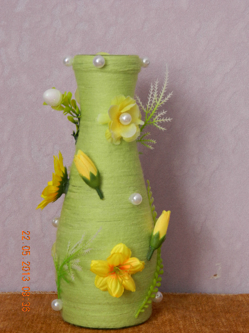 )))) очень медленно, не торопясь, по немногу мажу бутылку клеем "момент" и обматываю пряжей, надо обматывать чтобы не было просветов, я с одной такой вазой сижу 2-3 часа, и ещё чем ниточки толще-тем лучше )))