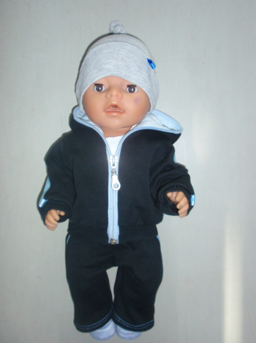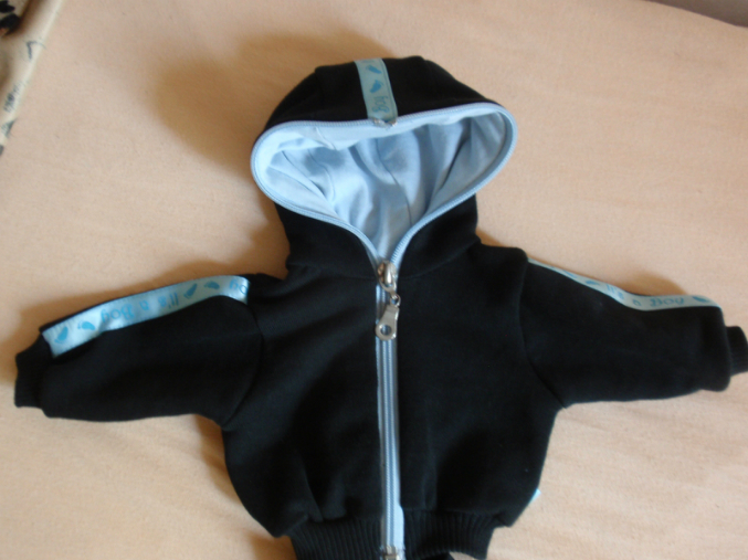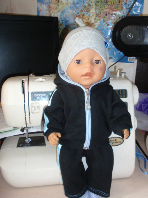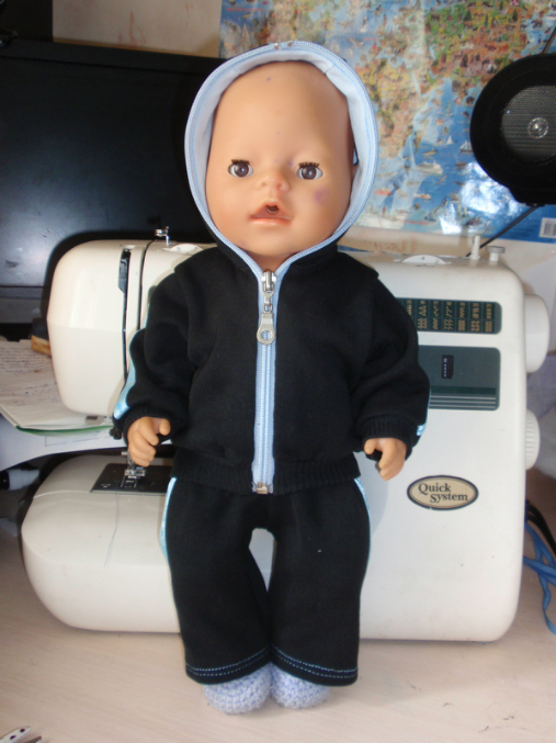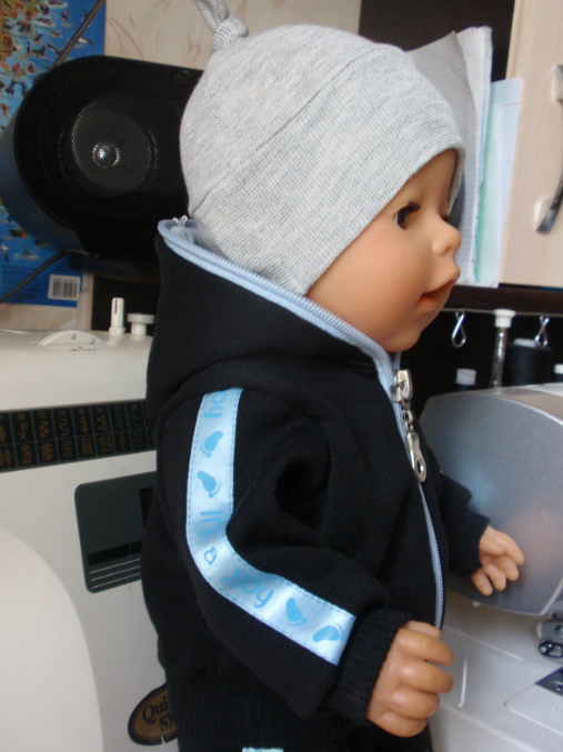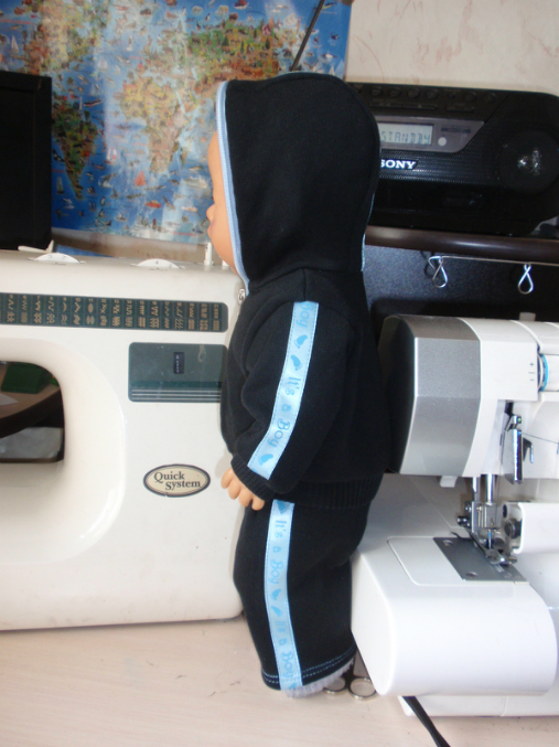 Шитье одежды, выкройки, ремонт одежды, шторы, швейные машины (уже приобретенные)Из остатков от дочкиных джинс, и остатков от переделки сына сшилось и для куклы. Из черной кофточки, резиннку которой я использовала для штанов сына сшился такой костюм для Бэбика.Чтобы было не скучно украсила атласной лентой. Замок тоже с какого то старья сняла, обрезать мне его было жалко и я его по всему капюшону пустила, из-за него же пришлось делать подклад на капюшон, для чего были изрезаны старые пижамные штанишки дочери (правда она об этом не знает, а то начнется истерика, потому что похоже барахольщица еще та растет, вся в мать