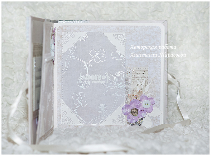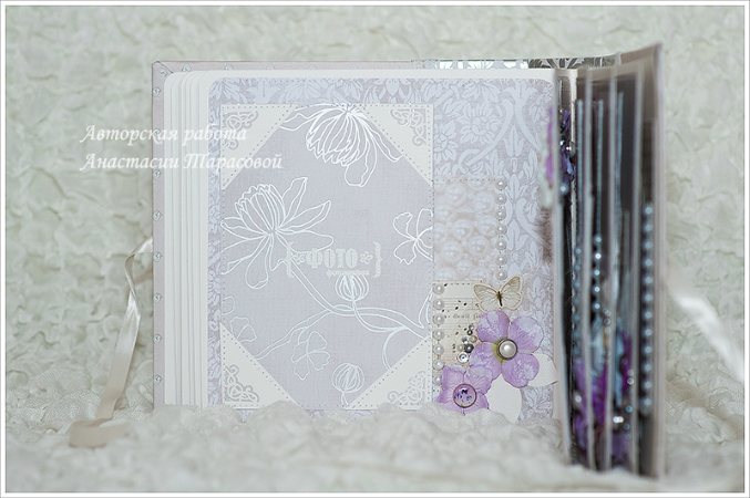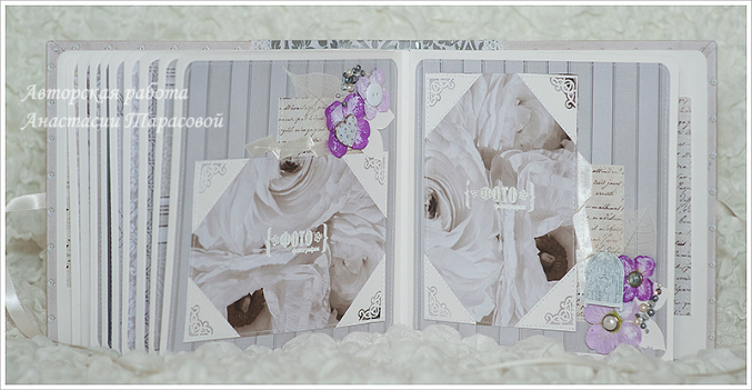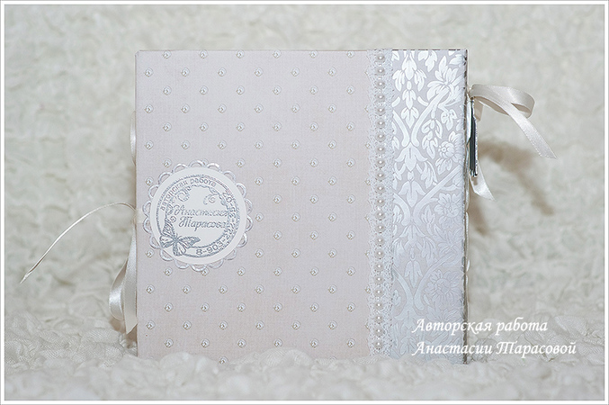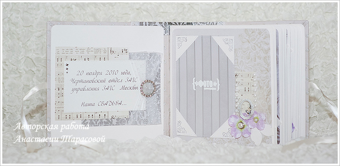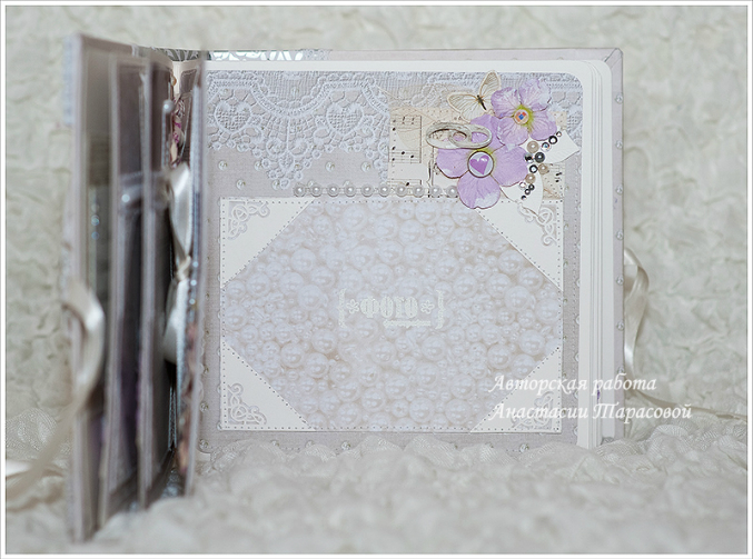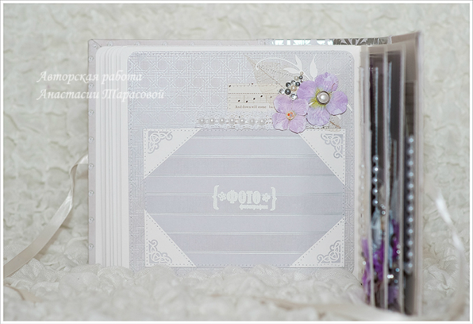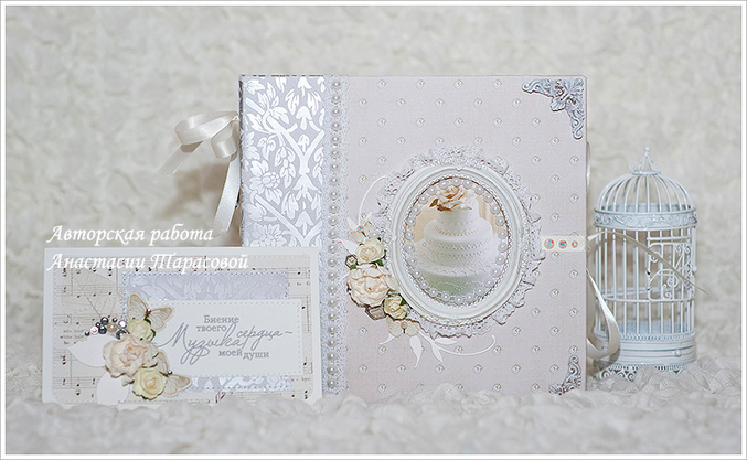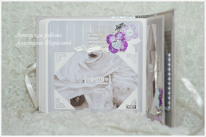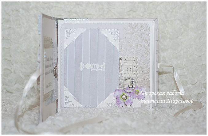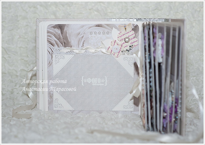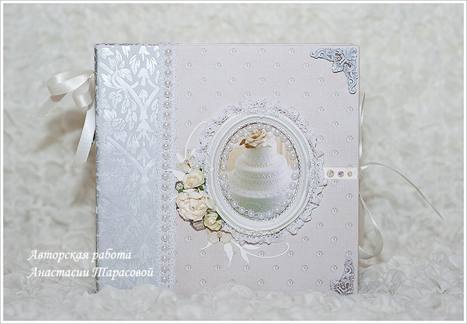 А это сам альбом. Серебристо-белый. С гипсовой рамкой на обложке. В рамке фото свадебного торта.