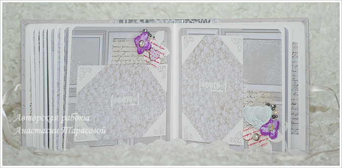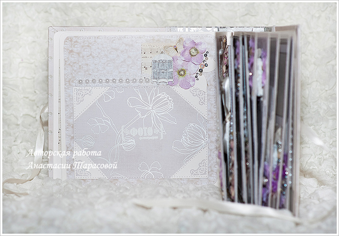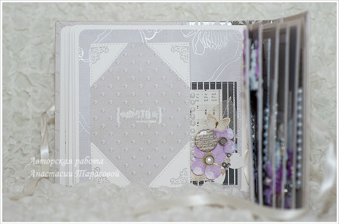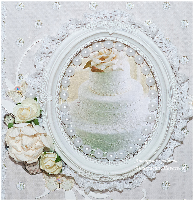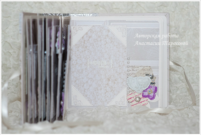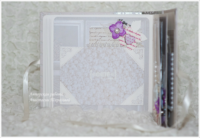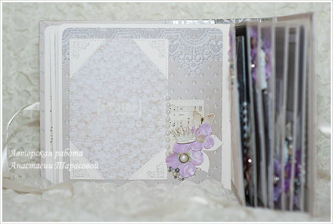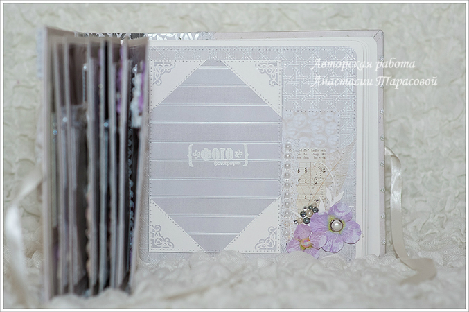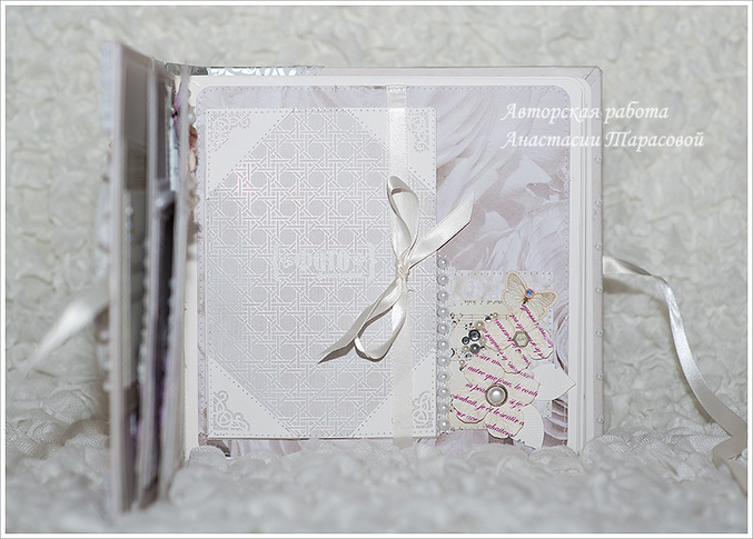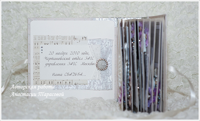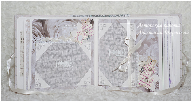А это сам альбом. Серебристо-белый. С гипсовой рамкой на обложке. В рамке фото свадебного торта.
