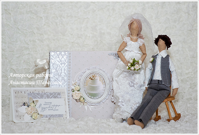 Свадебная пара куколок на самом деле принадлежит мне,а не заказчице:) (я их шила к третьей годовщине свадьбы с моим мужем). Просто они так хорошо подошли к альбому что грех было не усадить их рядом. И я подумала...какой хороший был бы подарок кому -нибудь на свадьбу! Альбом, открытка, свадебная пара, можно так же обложку для св-ва о браке сделать....Эх, мои все женаты и меня на свадьбу теперь врядли кто пригласит...по этому с радостью сделаю свадебную красоту кому-нибудь на заказ.