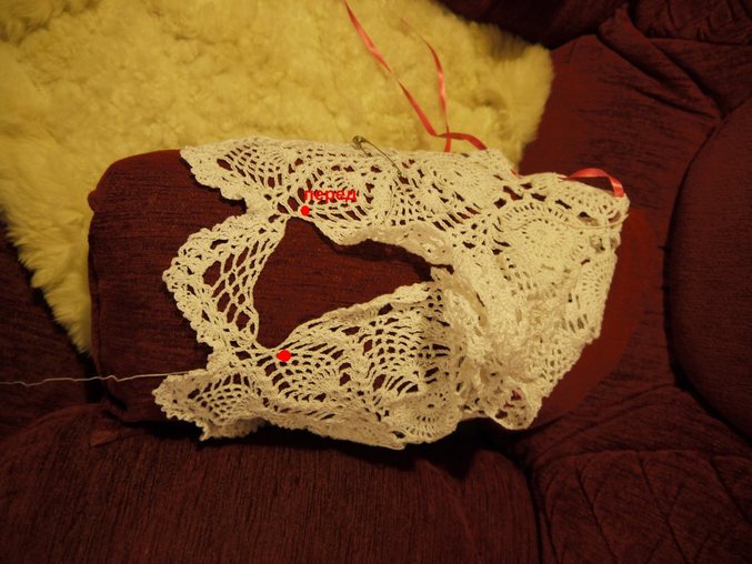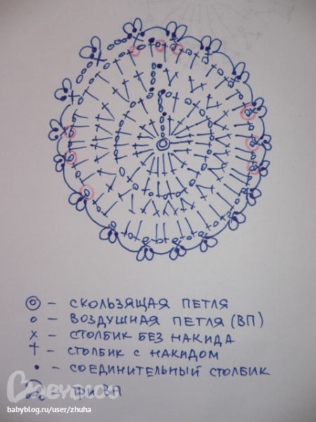 Как она вязала штанины. Красными кружками отмечены верхушки центральных ананасов передней и задней половин. Соединяем их цепочкой из вп, втискиваем в этот промежуток ананас и вяжем штанину по кругу. Аналогично вторую.