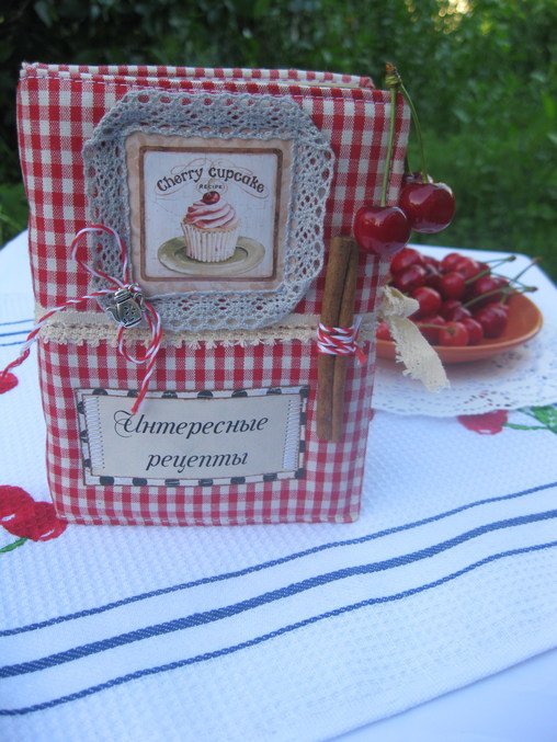 Сделана с нуля. Блок - переплет. Обложка американский хлопок, 150 листов тонированных в кофе. Страницы разлинированы с надписью интересные рецепты, которые нужно хоть раз, но приготовить. Из украшений - хлопковая лента-завязка, хлопковое кружево и двухцветный хлопковый шнурок, палочка корицы (па-а-ахнет), шармик- чайничек. Форзацы из скрап бумаги, есть кармашек для записей. 4 основных разделителя. Размер: 110х150 мм.