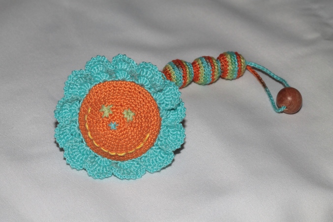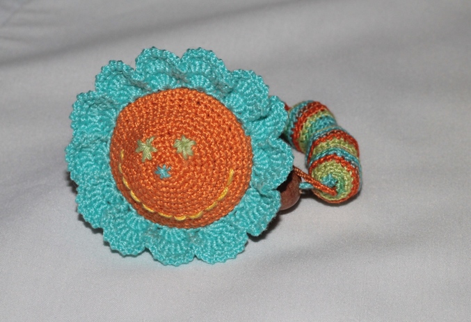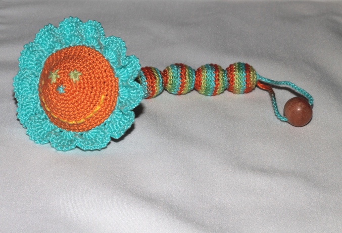 Благодарю Вас! На втором фото показана погремушка в том виде, в каком её можно одеть на ручку - петелька с бусинкой одевается на цветочек.