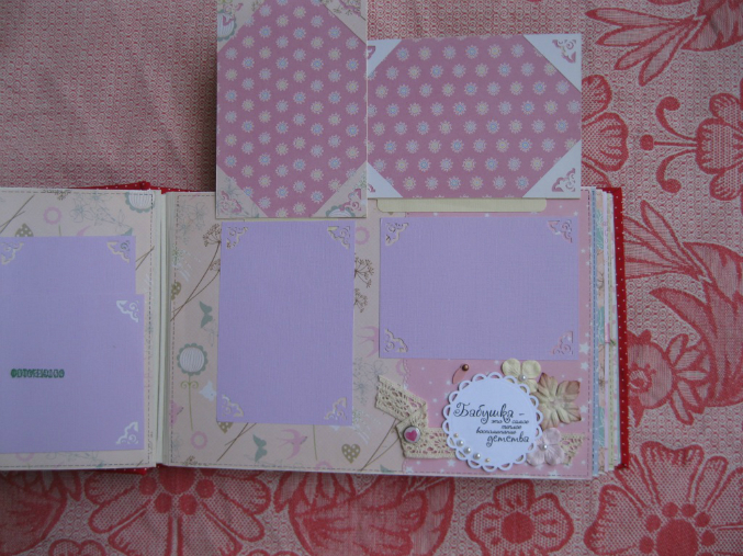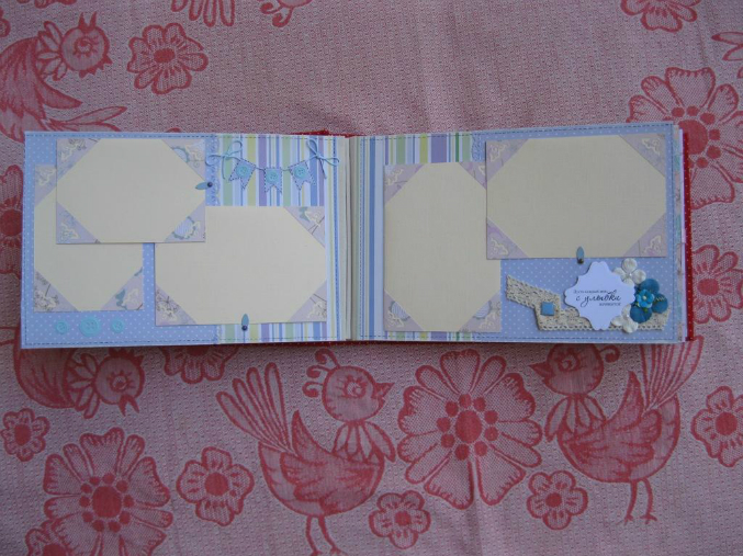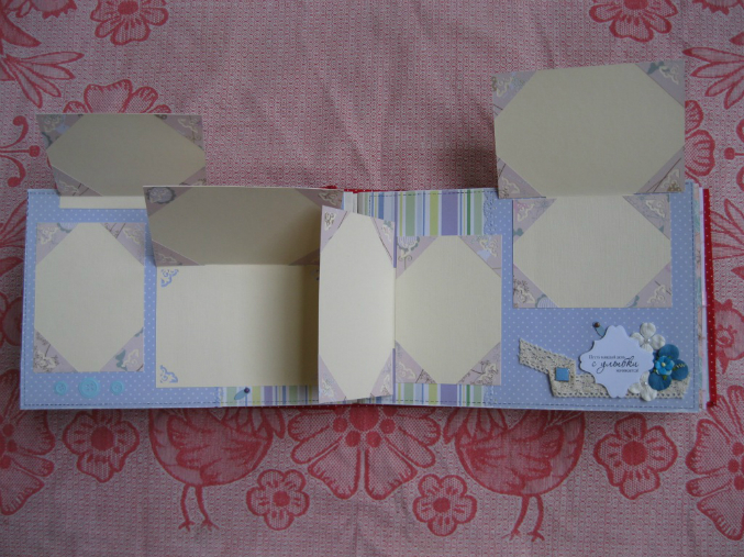 Разворот №5 вмещает 13 фото + кармашек. (подложки идут без уголков для фото - приклею чуть позже, просто дырик сломался)
