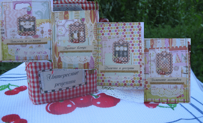 СкрапбукингСделана с нуля. Блок - переплет. Обложка американский хлопок, 150 листов тонированных в кофе. Страницы разлинированы с надписью "Интересные рецепты, которые нужно хоть раз, но приготовить". Из украшений - хлопковая лента-завязка, хлопковое кружево и двухцветный хлопковый шнурок, палочка корицы (па-а-ахнет), шармик- чайничек. Форзацы из скрап бумаги, есть кармашек для записей. 4 основных разделителя. Размер: 110х150 мм.