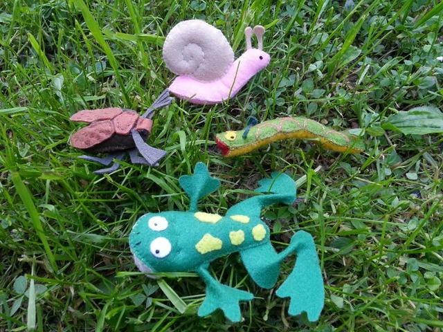 ФетрСидим с дочей (1.4 года) на даче, она в восторге от всяких жуков-гусениц. Каждый раз отбираю с боем, да и живность тоже жалко, лапки-крылышки отрывают....Сшила замену из фетра. Гусеница из китайского, остальные из корейского жесткого. Выкройка моя. Нужна ваша критика т.к.хочу делать игрушки и на продажу, 1.5 года через месяц, денюжки нужны ой как...Лягуха вот мне не нравится, хочется такую толстенькую сделать, более реалистичную что-ли, может лапы набивные сделать? Продолжение серии будет, в планах бабочка, паук, стрекоза, божья коровка и что еще доче приглянется. Пока у нас бзик на майских жуков))