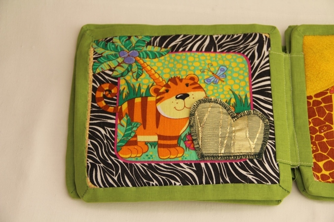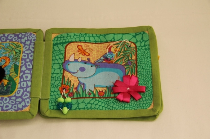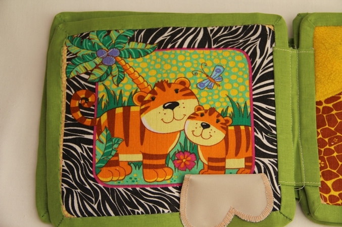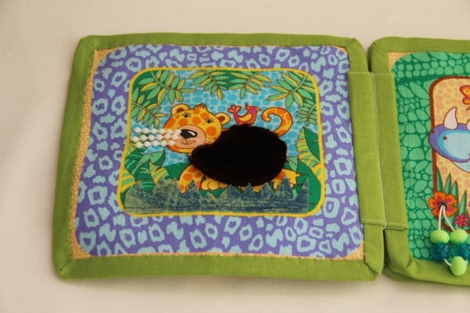 Развивающая книжка выполнена из бязи с детским рисунком, на каждой странице - отдельная яркая картинка и несколько развивающих элементов, выполненных из материалов разных фактур (дерево, ткань, пластик, искусственный мех, жалюзи). Для лучшего восприятия психологи и педагоги рекомендуют крупные, понятные картинки, в которых выделены существенные детали. Книжка содержит также массажные элементы для развития тактильных ощущений ребенка, развития мелкой моторики, более развитой координации движений руки и пальцев. Играя страницами книги, можно знакомить малыша с животным миром, расширять его кругозор.