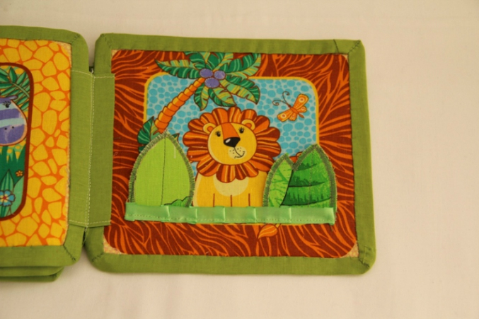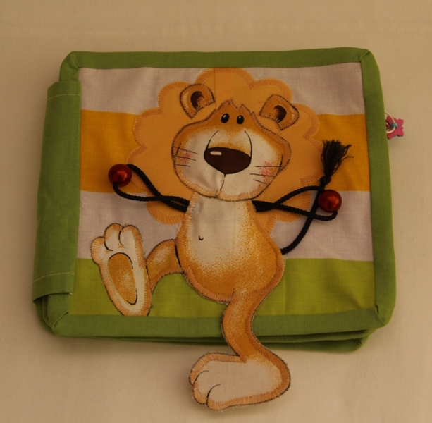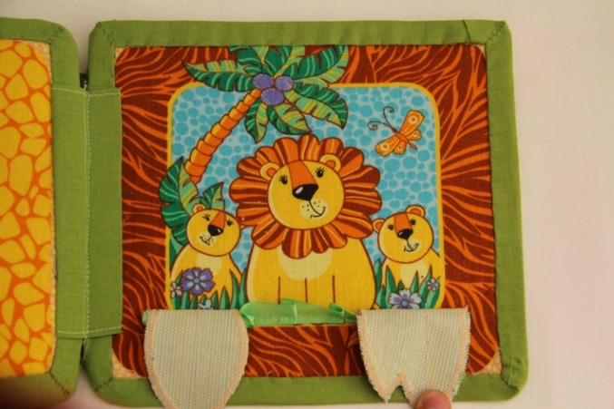 Обложка книжки – самостоятельная игровая страница (седьмая): на обложке львенок, которого можно подергать за свисающую ногу, ручки-бусины или кисточку хвоста.