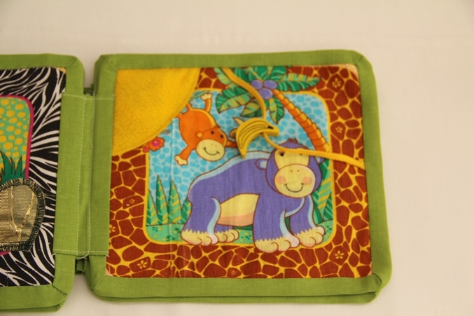 4 страница: обезьяны (солнышко шуршит, приятное на ощупь (флис), можно угостить большую или маленькую обезьянку бананом (выполнен из дерева, можно перемещать вверх-вниз).