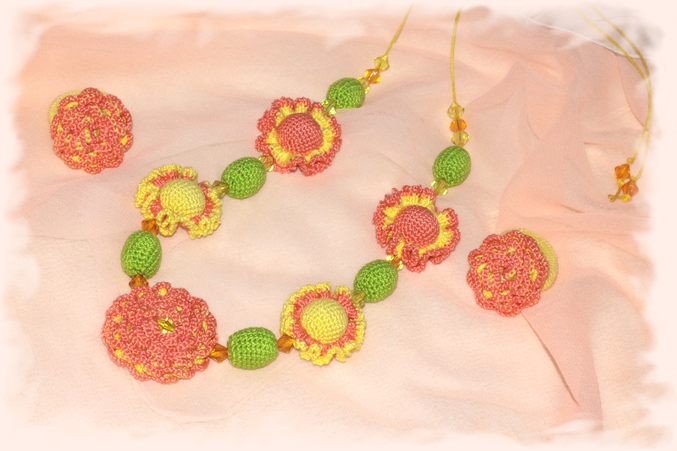 Комплект связан из хлопковых ниточек, использованы акриловые бусины, вощёный шнур, резиночки и основа для колечка.