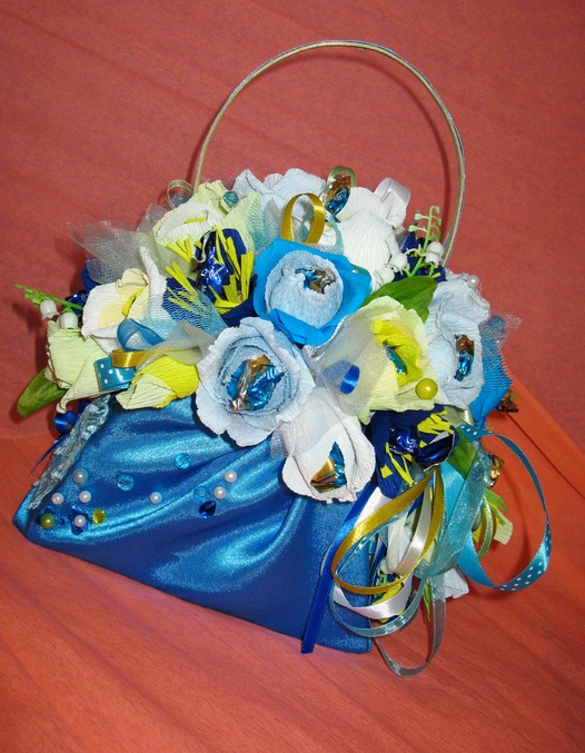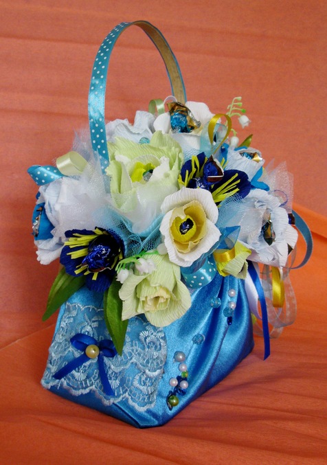 Ритуль, синий в последнее время - очень популярный цвет для композиций)) Сумочка. на мой взгляд сложилась удачно! Ну ручка тебе не нравится, а мне понравилась на ней лента, очаровательно вписывается в клмпозицию. Из критики - не очень люблю сочетание синего с салотово желтым, на мой взглях очень экстримальное, я бы в синенькие цветочки тычинки более мягкого цвета присмотрела, темно желто-оранжевого. Ну это только мой субъективный взгляд)))