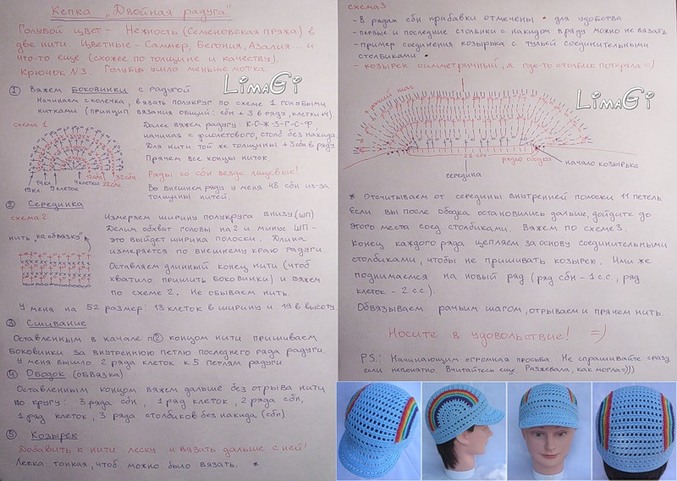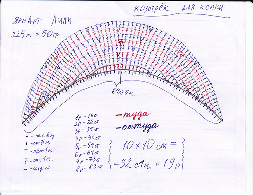 У меня есть схема другой формы козырька, если интересно, могу найти, но я поленилась его вязать, хтя потом и этой формой осталась довольна)))