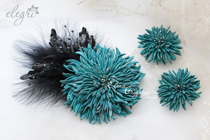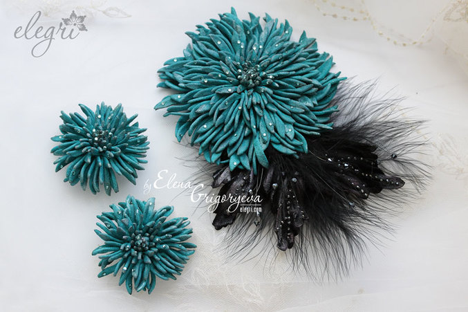 Изделия из кожиА вот и продолжение комплекта.... Создала брошь из итальянской замши, все горит и переливается. Стразы Сваровски украсили лепесточки и листики. Больше информации и фотографий можно посмотреть здесь: