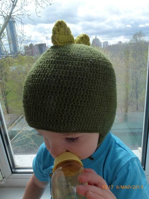 берем пряжу нужного цвета и вяжем как обычно щапочку из ссн, делая по 12 прибавок в ряду, когда блинчик будет нужного диаметра (ог:3) вяжем дальше без прибавок. затем вывязываем ушки и завязки, набираем 15ссн и в каждом ряду по краям делаем убавки, получается 15,13,11,9,7,5,3 с общей вершиной, прям тут же, не обывая нить, вяжем 50вп и соединительными столбиками по этой цепочке возвращаемся в ушку, обрываем нить, запрвляем, второе ушко так же. затем начинаем вязать хвостик, набираем все петли которые между ушками и вяжем по такому же принципу, убавляя по краям. гребешок вяжутся отдельно треугольнички и потом к шапке пришиваются, 1р.8ссн, 2р..ссн прибавка,  3р.2ссн прибавка и т д.  подкладка вяжется по точно такому же принципу, потом подклад вкладываю в шапочку и обвязываю захватывая подклад и шапку