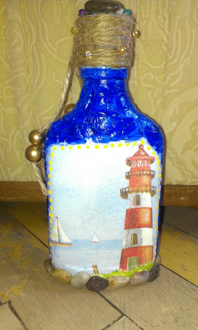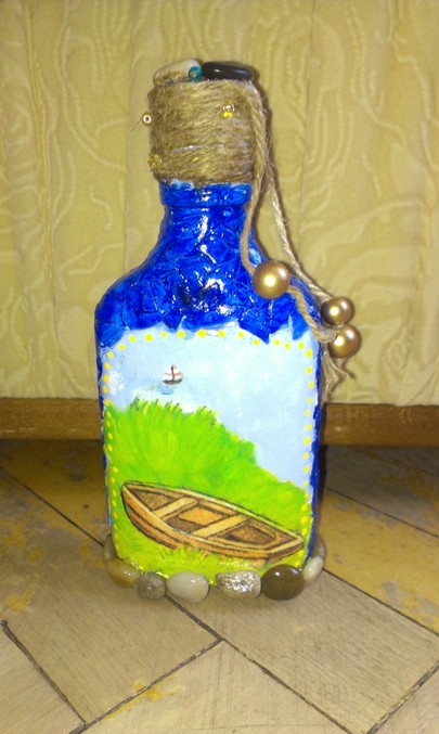 Бутылочка в морской тематике, в подарок бывалому моряку. Посмотрела много бутылочек подобных, получилось, конечно, что-то свое и из того, что было. Контур лодочки обвела гелевой ручкой))