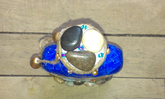 Советы можно, да?))) Морскую бутылку стоило бы сделать с чуть более приглушенным цветом синим. Взять белую краску и губку и немножко пройтись по поверхности скорлупы, так и фактура выделится и бутылка станет выглядеть как будто море и пена. Мягче станет цвет.