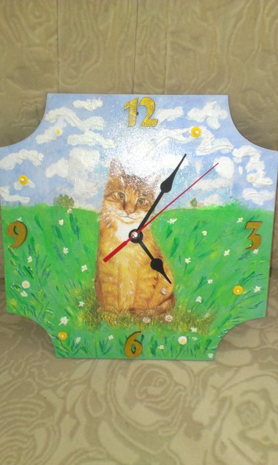Часы Кошка, в подарок подруге, которая их очень любит. Интересно было смешивать цвета, чтобы получить нужный. Для объема облаков и травы добавила шпаклевку, и сделала в техники квиллинг цветочки для обозначения времени
