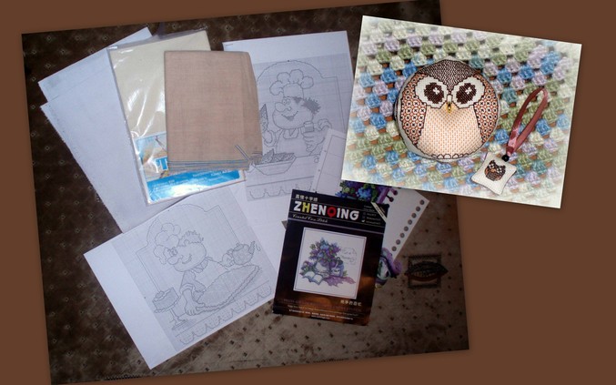 Описание: 2 отреза канвы Aida 14, белого цвета (49х37,5 см), бежевая (39х45 см), отрез накладной канвы из старых запасов (по окончании работы ниточки канвы выдёргиваются), 2 распечатанных ч/б схемы поварят и остатки от уже вышитого набора (ниточек хватит на ещё один отшив, схема в хорошем состоянии), бискорню-игольница и маячок на ножницы