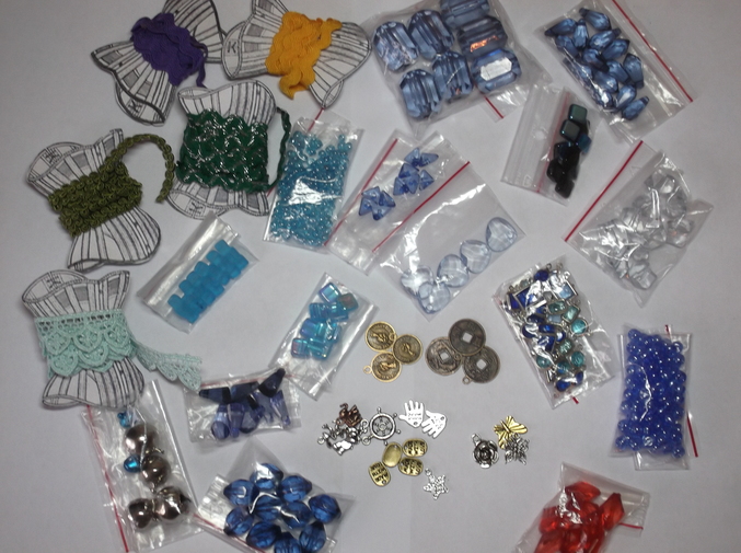Описание: разные бусины, пластиковые подвески, металлические подвесочки разной формы и цвета (есть плоские и 3d) , бубенчики трех размеров по две штуки, кружево нежно голубое (0,5 м) и тесьма плоская (желтый и синий около 1м каждой, зеленая с люрексом около 2 м) объемная зеленая ( около 1м). Блокнотик-брелок ручной работы размер 5х3,5см, коптский переплет около 60 листов, форзацы выполнены из скрап бумаги ручной работы. Мягкая обложка из микровельвета, украшена хлопковым кружевом, закрывается на петельку.