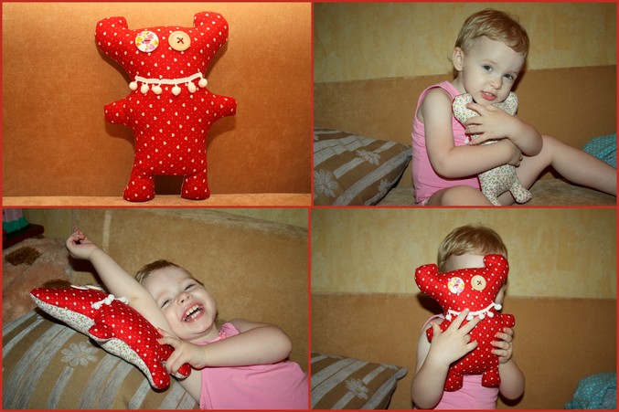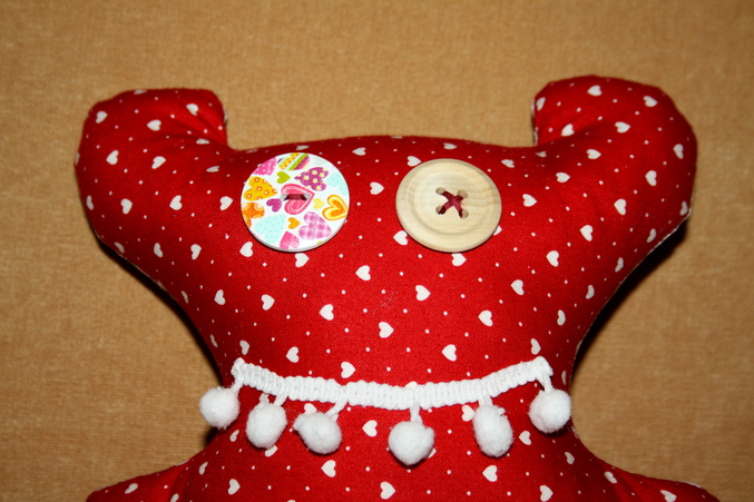 Сшит из двух разных тканей, выкройку рисовала от руки, внутри синтепух, глазки - пуговички, ротик - ленточка.