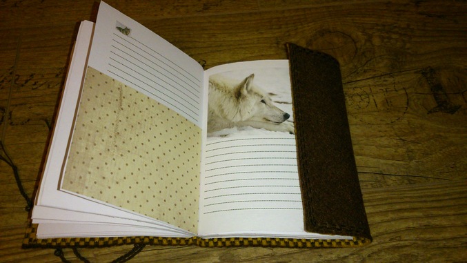 Нравиться тематическое оформление и в этот раз темой стали волки, а точнее волчица и совсем не злая. Блокнотик выполнен в строгом стиле, коричневые тона (от темно-коричневого до светло-горчичного). Украшением служит нитка-резинка сплетенная в косичку с бусинками, она же и является завязкой для блокнота. ЗапАх обложки блокнота служит закладкой. В блокноте 120 страниц, 2 кармашка для записочек.