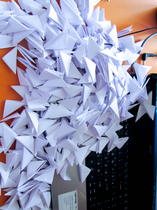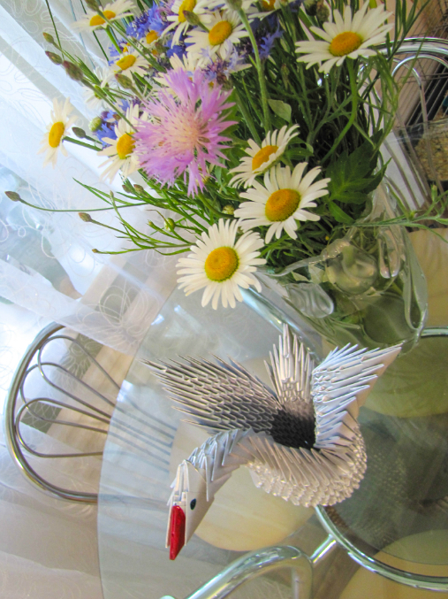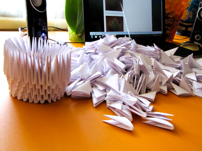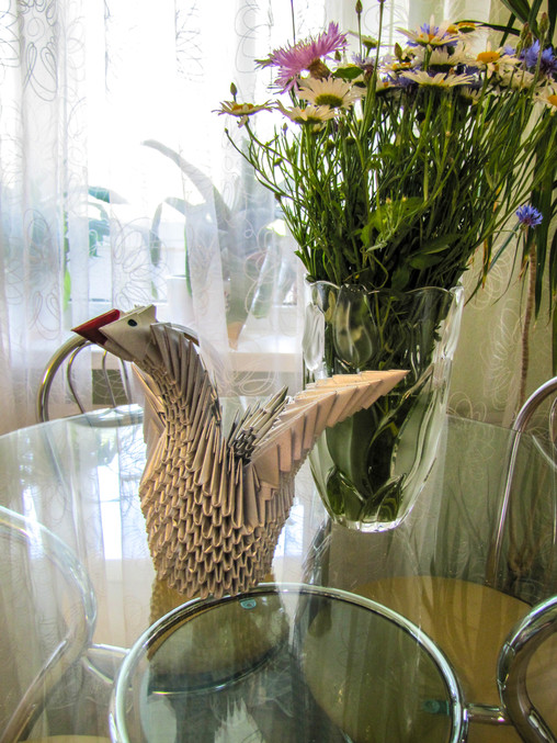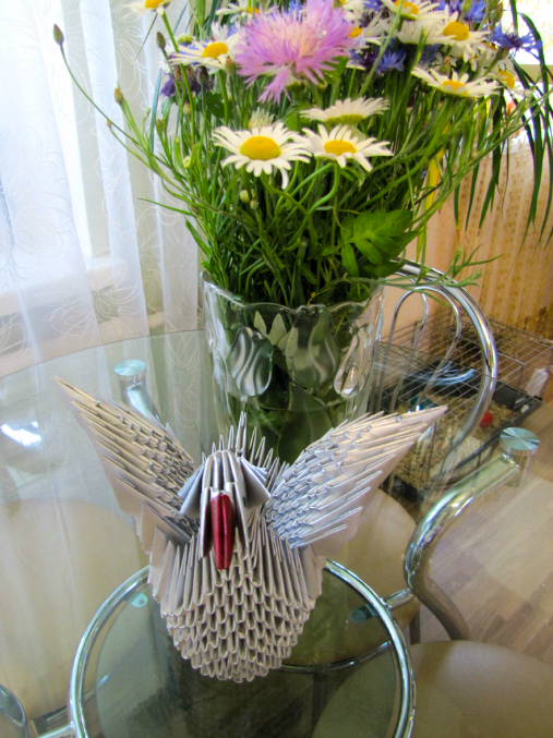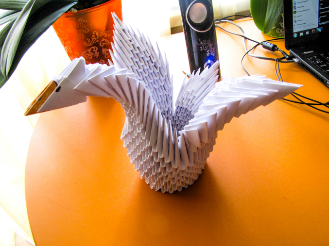 спасибо)))на самом деле я делала по самой упрощенной схеме.У меня всего около 500 модулей было...вот если бы не меньше 1500 - тогда получается такая птица,что аж дух захватывает))))))) если вы в любом поисковике введете "как сделадь лебедь оригами" вам выбросит и видео и тысячу МК....Берите срузу посложнее - уж если делать - то один раз и так что б впечатлило)))удачи!