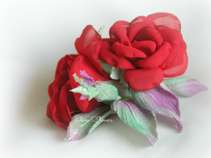 И брошь веточка с 2мя шифоновыми розами шелковым бутоном и шелковыми листиками.