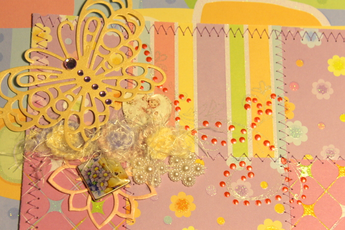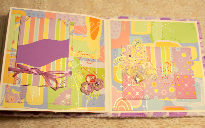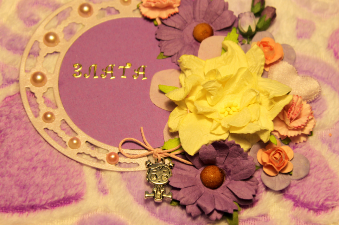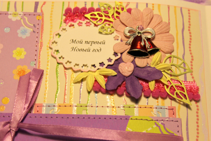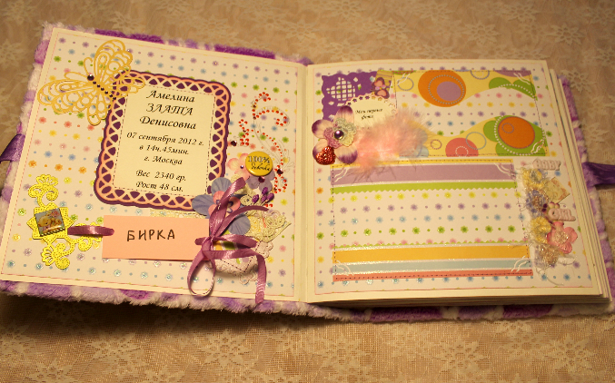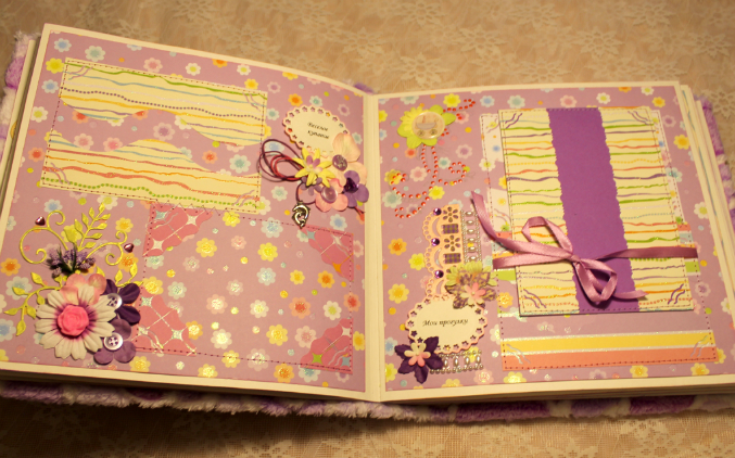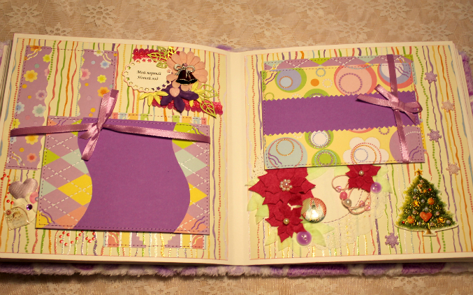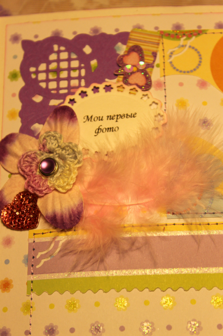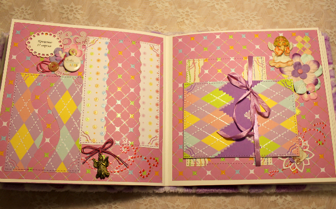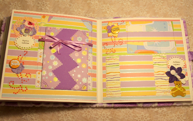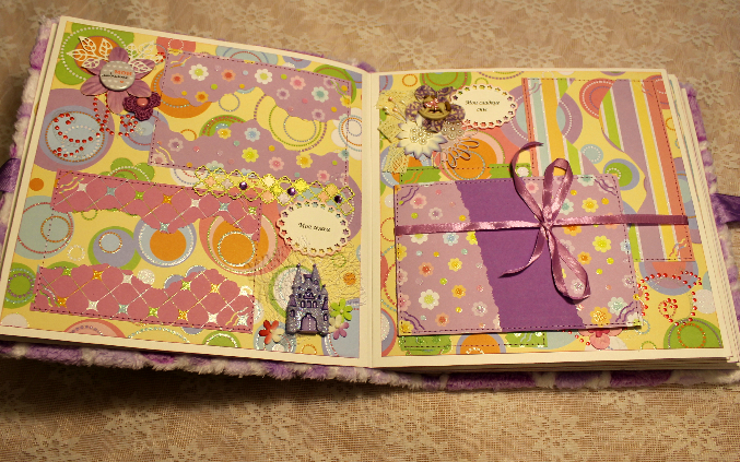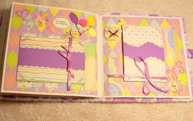 СкрапбукингВот такой альбомчик получился для малышки Златы. Размер 25х25см, мягкая, пушистая обложка на ленточках. Вмещает 45 фотографий. Бумага "The Glitter STACK", вся с глиттером. Странички- первые фото, моя семья; купаюсь, сплю, играю, кушаю, Новый год, крещение, день рождения. В конце альбома карман для диска и допол.фото.